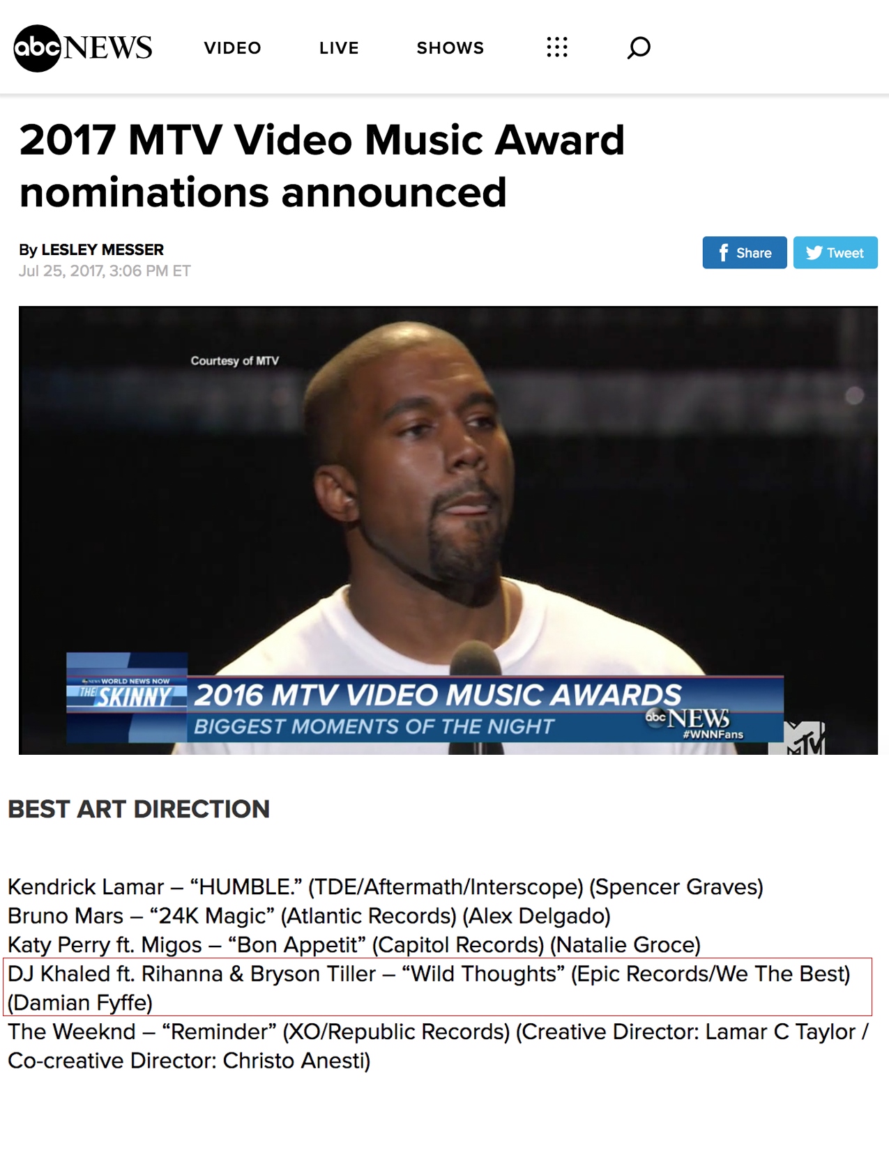 7.25.17 – ABC News – 2017 MTV Video Music Award Nominations Announced