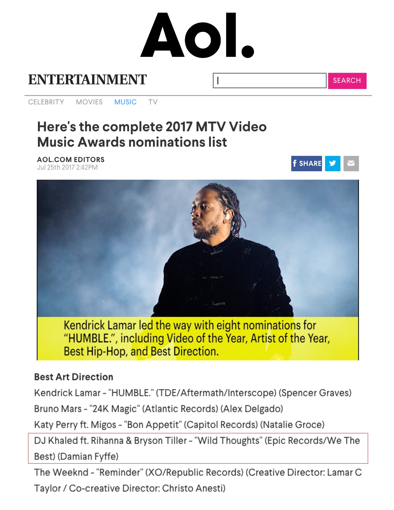 7.25.17 – AOL – Here’s the complete 2017 MTV Video Music Awards Nominations List