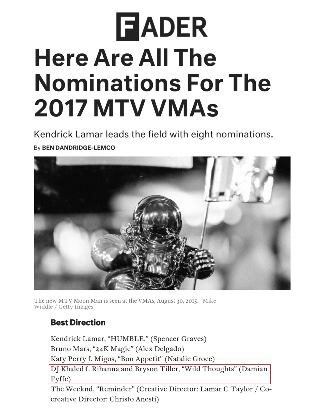 7.25.17 – Fader – Here Are All the Nominations for the 2017 MTV VMAs