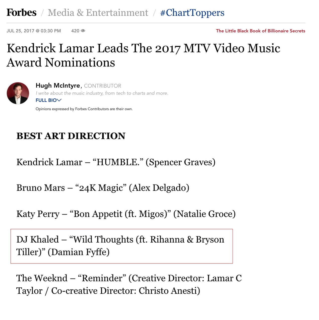 7.25.17 – Forbes – Kendrick Lamar Leads The 2017 MTV Video Music Award Nominations