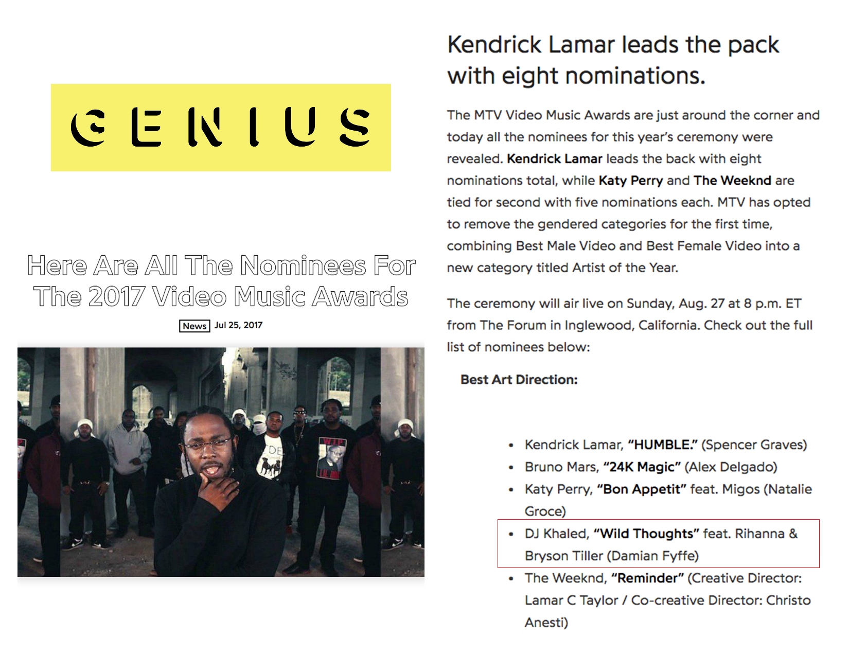 7.25.17 – GENIUS – Here Are All The Nominees for the 2017 Video Music Awards