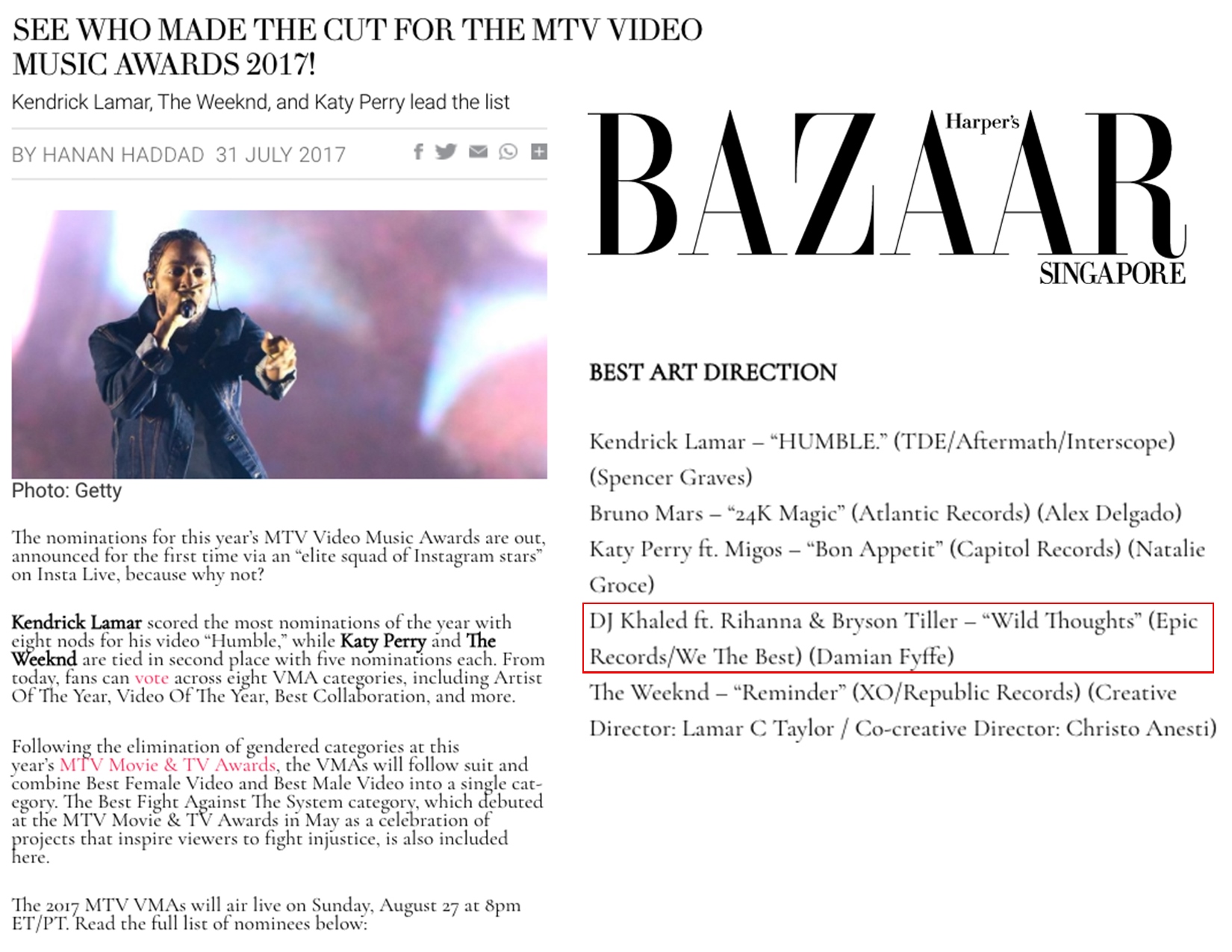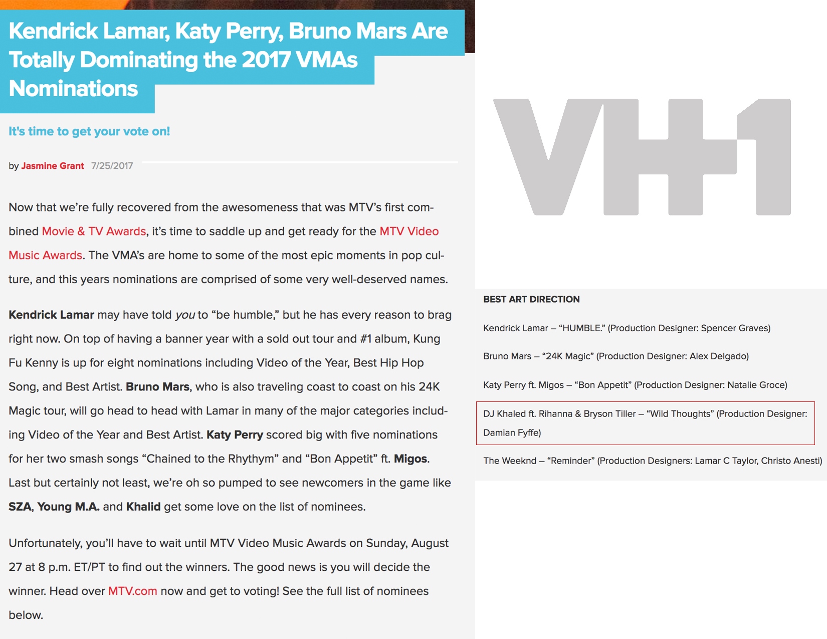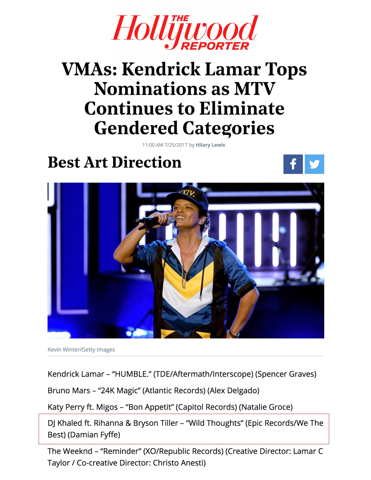 7.25.17 – Hollywood Reporter – VMAs: Kendrick Lamar Tops Nominations as MTV Continues to Eliminate Gendered Categories