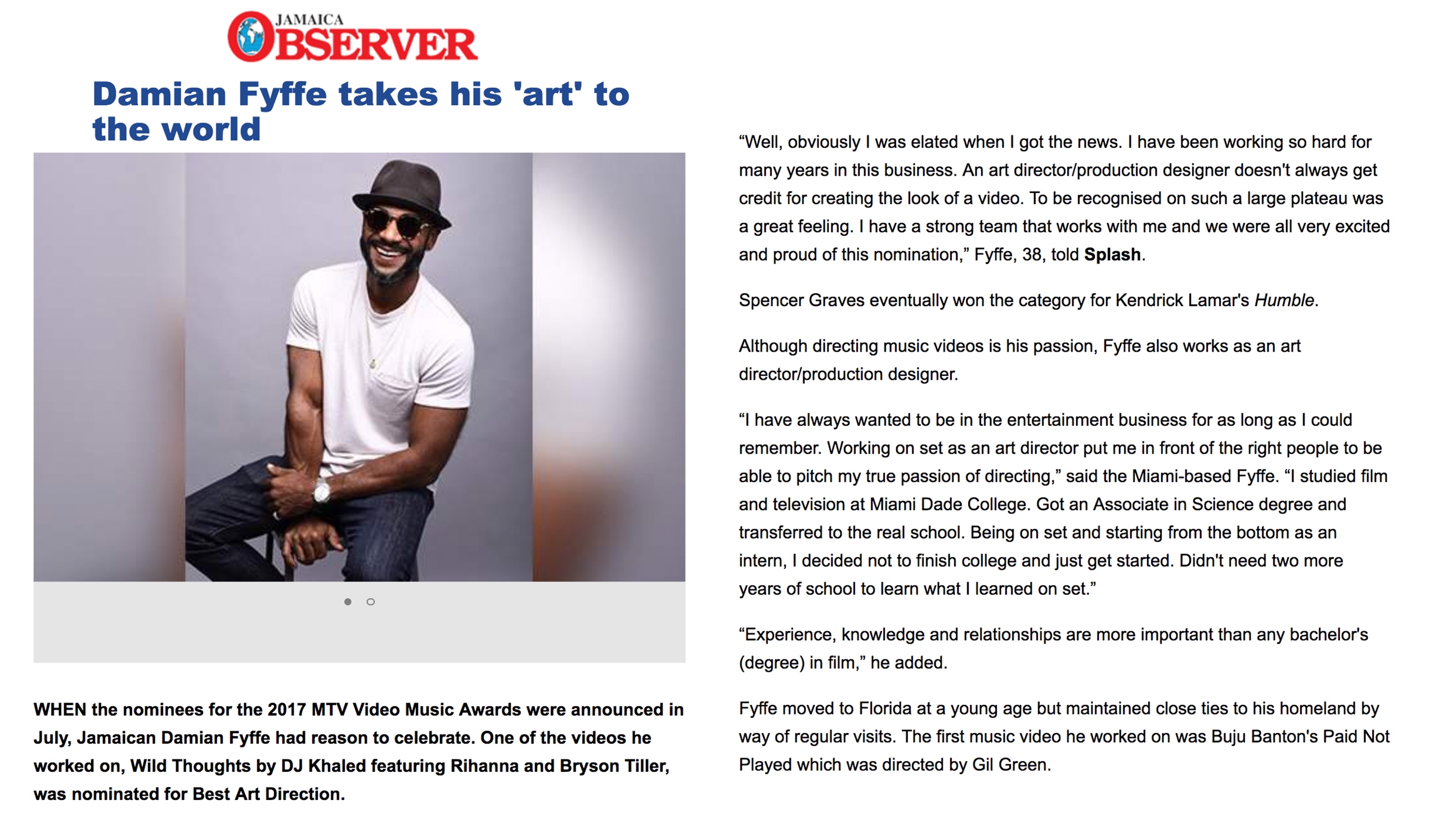 12.15.17 – Jamaica Observer – Damian Fyffe takes his ‘art’ to the world