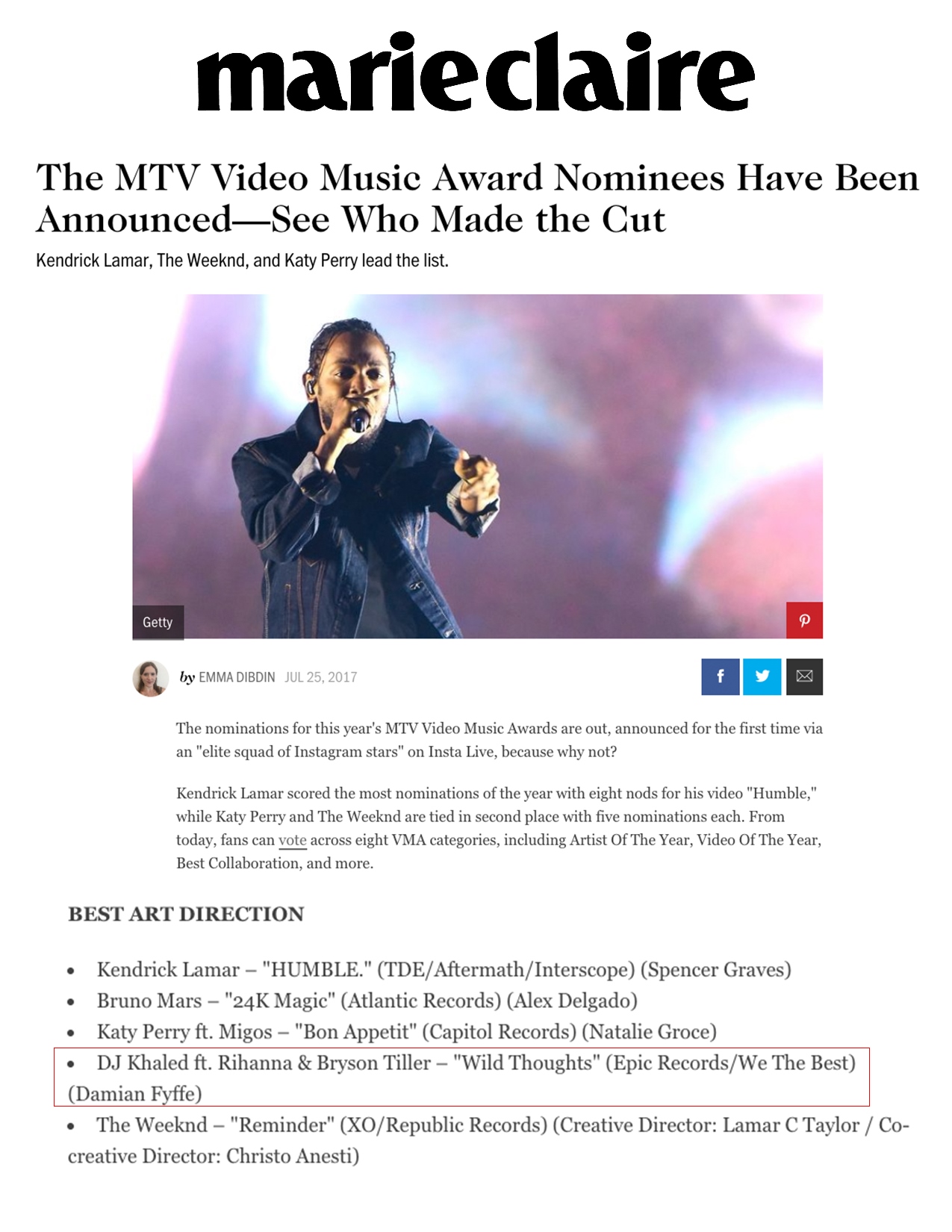 7.25.17 – Marie Claire – The MTV Video Music Award Nominees Have Been Announced – See Who Made the Cut