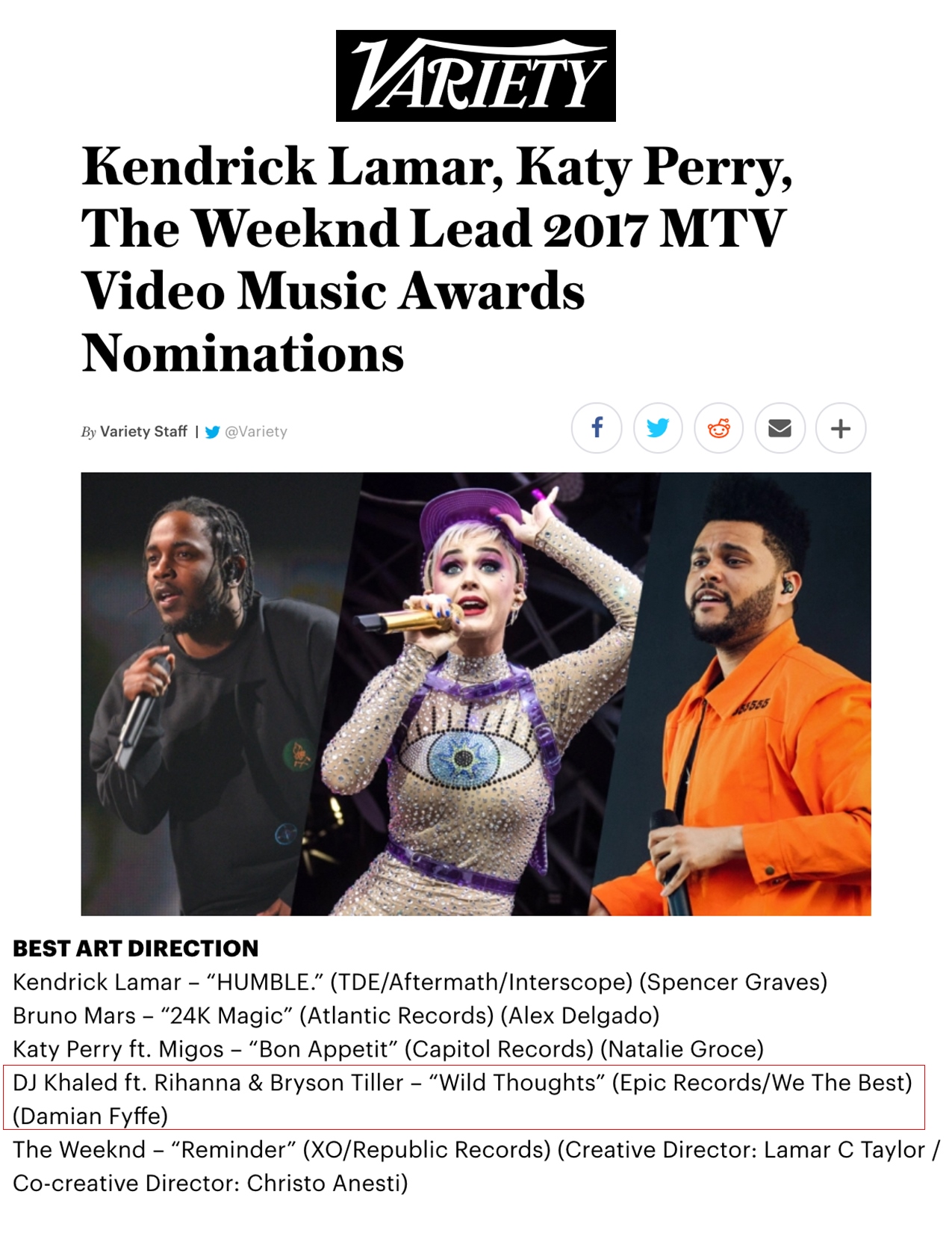 7.25.17 – Variety – Kendrick Lamar, Katy Perry, The Weeknd Lead 2017 MTV Video Music Awards